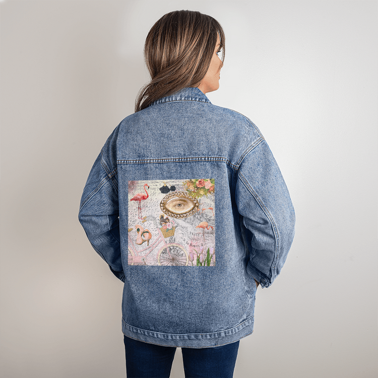 Chaqueta vaquera extragrande con efecto lavado rosa y collage de París para mujer