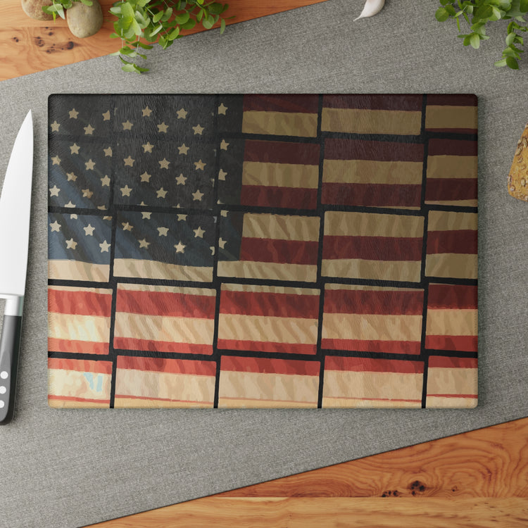 Tabla de cortar de vidrio con la bandera estadounidense en bloques