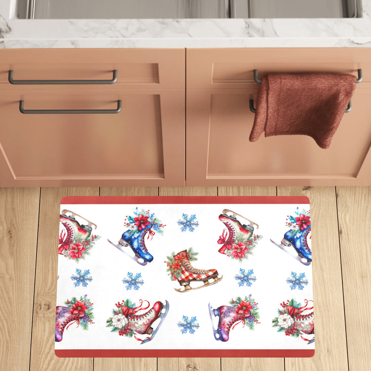Add festive charm to your kitchen with this charming Christmas Skates kitchen mat featuring a cheerful red border. Measuring 32"x20", this mat brings holiday spirit to any space while protecting your floors from spills and splashes. Proudly made in the USA, it combines quality craftsmanship with seasonal style. The durable design withstands daily foot traffic, making it both functional and decorative. Perfect for holiday entertaining or adding warmth to your kitchen decor throughout the season.