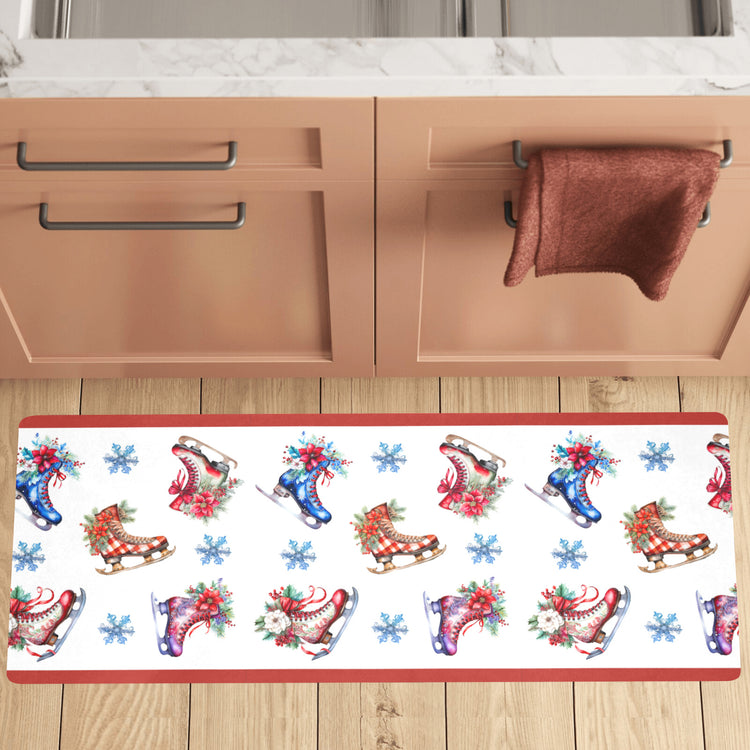 Glide into the holiday spirit with this charming Christmas Skates kitchen mat, featuring festive vintage skates adorned with a bold red border. Measuring 48" x 17", this generous mat covers substantial counter or floor space, making it both functional and decorative. Proudly made in the USA, it combines quality craftsmanship with seasonal charm. The durable design withstands daily kitchen traffic while adding nostalgic warmth to your holiday décor. Perfect for creating that cozy, festive atmosphere that transforms your kitchen into a winter wonderland. Whether you're hosting gatherings or simply enjoying the season at home, this mat brings joy and practicality to every step.