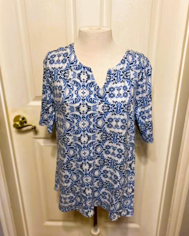 Elevate your wardrobe with our Croft & Barrow Splitneck Top! Crafted with elbow sleeves and a split neckline, it effortlessly blends comfort and style in a single garment. Made with soft, lightweight fabric, our preowned top is perfect for any occasion. Upgrade your wardrobe with this versatile top, available in size XL.