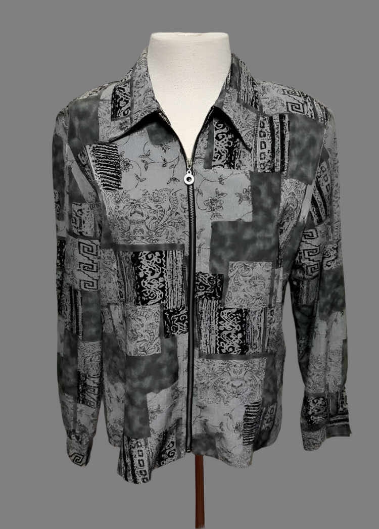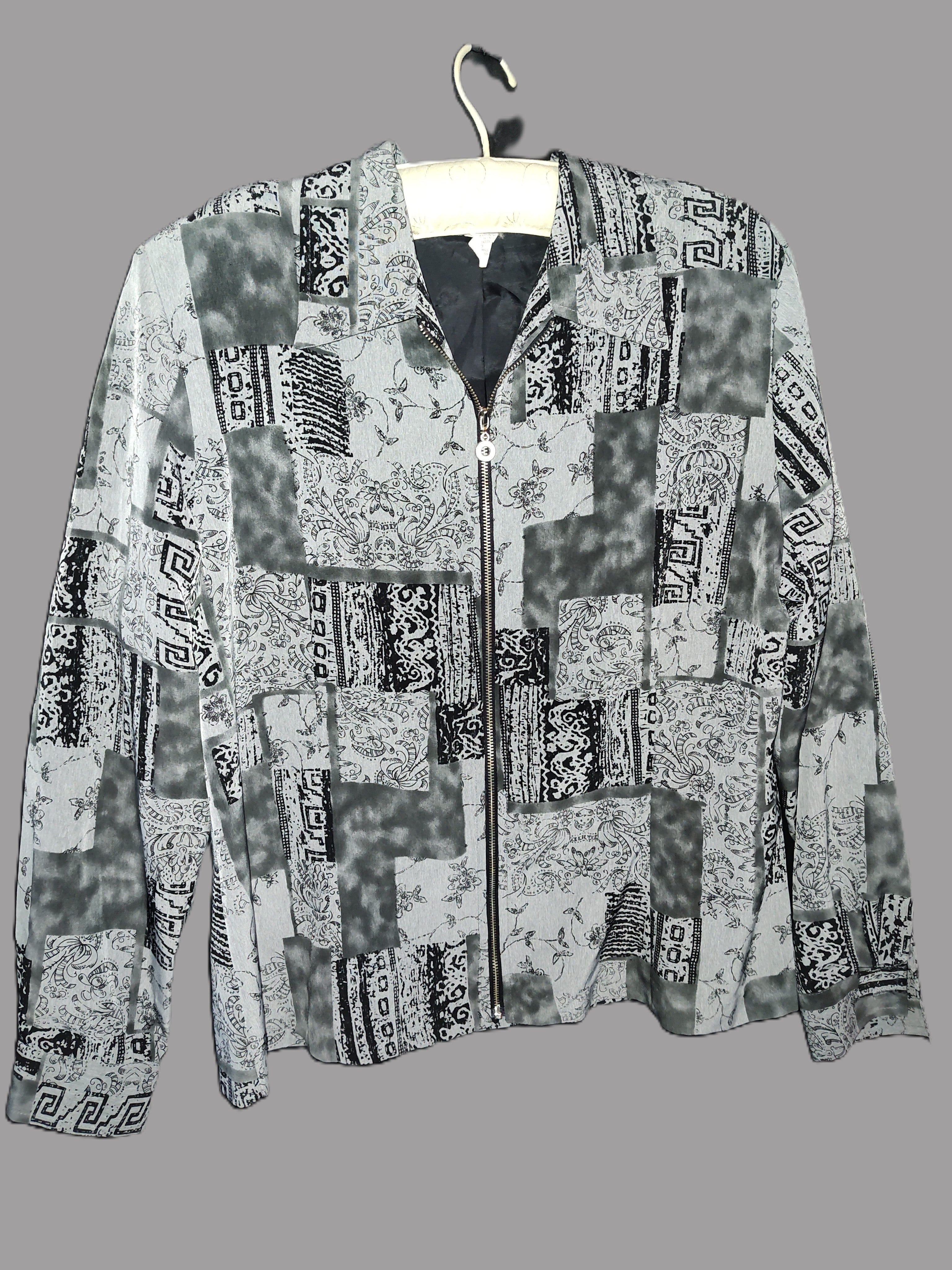 This Dressbarn black and gray jacket in size Large features a sleek zipper design that adds both style and function. Stay stylish on the go with this versatile patchwork jacket. Perfect for layering or as a standalone piece, it's a must-have addition to your wardrobe!  This preowned jacket is in excellent condition.  Shipping is included in price.