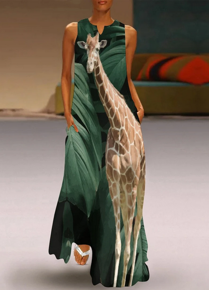 Save 15% when you buy the Giraffe Maxi Dress Outfit Bundle, which includes the Beaded Belt Straw Panama Fedora Hat, Tall Giraffe Dark Green Sleeveless Maxi Dress - Size L, and the Women's Brown Wedge Platform Sandals.