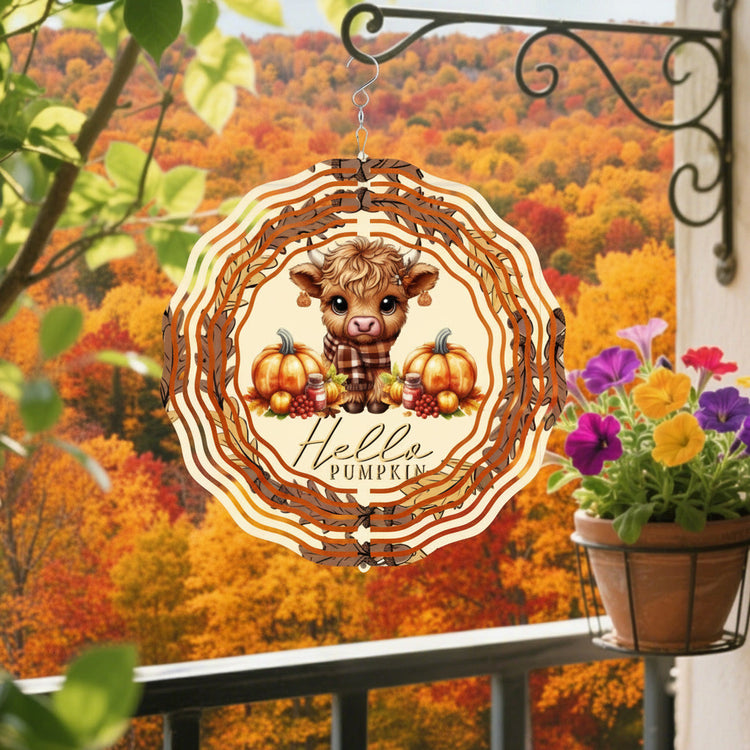 Experience the charm of the Hello Pumpkin Cute Highland Cow Wind Spinner, featuring the same delightful design on both sides and crafted from durable tinplate. Its innovative 3D structure allows the chimes to be manually unfolded into a dynamic, spinning sculpture that dances in the breeze. As it rotates, reflective elements catch the light, casting vibrant rainbows and enhancing its three-dimensional appeal. This eye-catching spinner brings a lively, artistic touch to any outdoor space, turning light and wind into a captivating visual celebration.