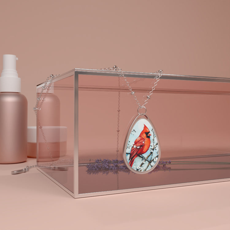 Red Bird in the Snow Oval Necklace