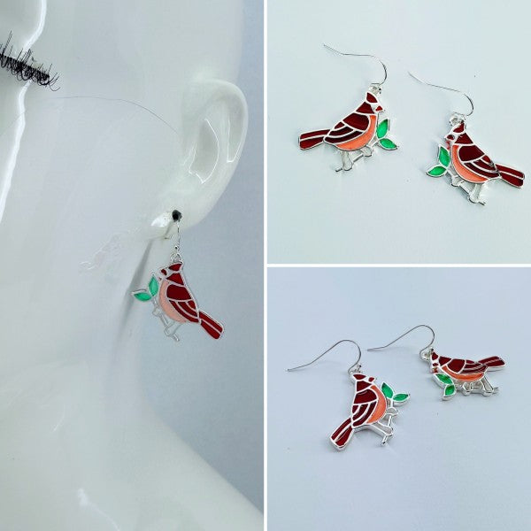 Brighten your style with these silver-finished earrings featuring clear epoxy and a vibrant red cardinal bird design.