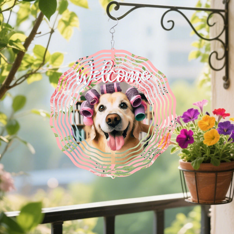 Add a charming and playful touch to your porch or garden with this Smiling Dog with Hair Curlers Tin Welcome Sign Wind Spinner. Crafted from durable tin, this unique decor piece combines a warm welcome with whimsical movement, enlivening your outdoor space as it spins gently in the breeze. Its eye-catching design brings joy to visitors while showcasing your fun and friendly style. Perfect for dog lovers seeking a delightful and inviting accent to brighten any entryway. Great as a welcome sign at a beauty saloon!