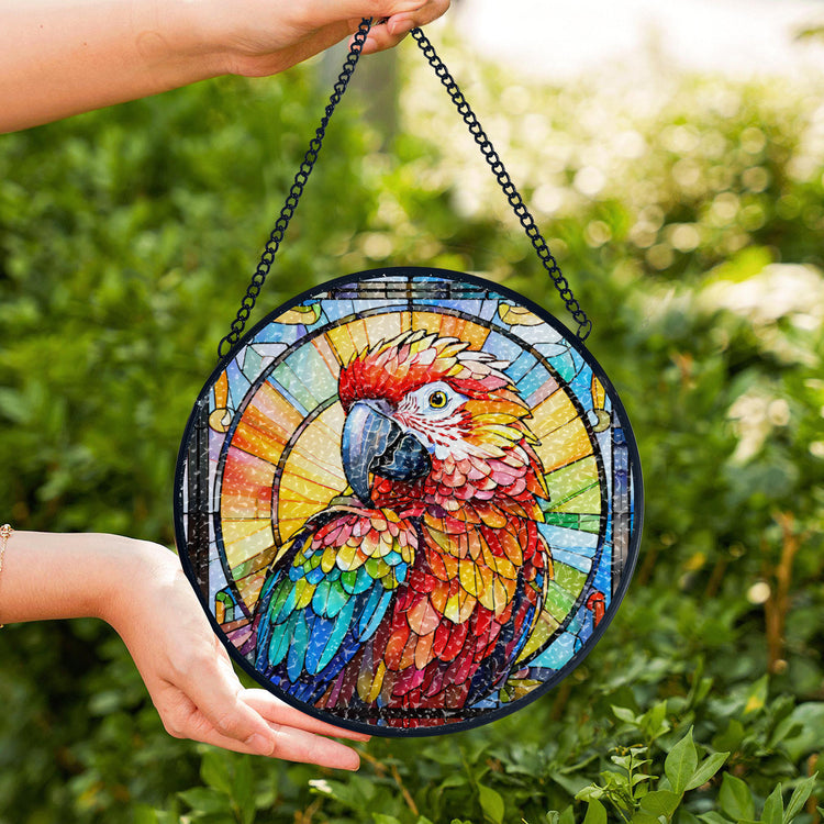 Brighten your living space with the Stained Glass Colorful Bird Parrot Suncatcher. This vibrant decor piece captures light beautifully, creating a captivating display of colors that enhances any window or room. Its intricate design adds a touch of artistry and charm, making it an ideal accent to elevate your home’s ambiance. Item has the look of stained glass, but that is just part of the design.