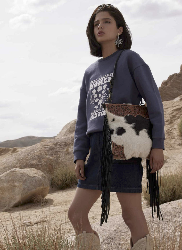 Turn heads with the hand tooled leather purse from Myra, a masterpiece of rustic elegance. Featuring a hand tooled leather scalloped top in rich caramel, complemented by striking hair-on hide and cascading black fringe, this bag is a true statement piece. The spacious interior includes a zipper pocket, while the back boasts smoky charcoal canvas with an extra zipper compartment. Adjustable and versatile, this tooled purse blends artistry with practicality.  Shipping cost for this product will be added at checkout.