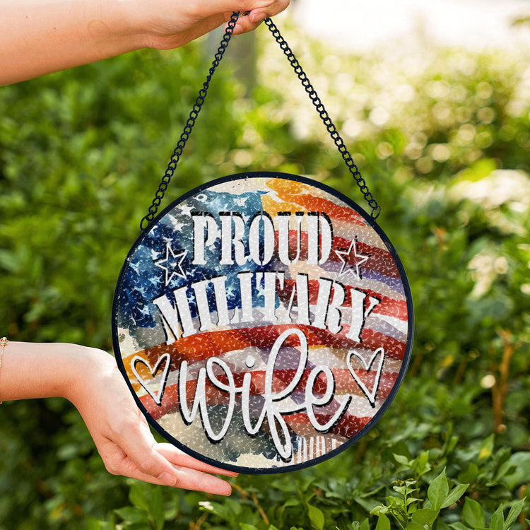 Honor military service with this stunning glass suncatcher, a radiant tribute to proud military wives. Crafted from premium soda-lime glass using high-temperature firing technology, it captures and refracts light beautifully, casting enchanting patterns that transform any space into a gallery of warmth and meaning. The single-sided design and sturdy metal chain make it effortless to display in windows, entryways, or bedrooms, creating an instant focal point that celebrates courage and commitment. Whether adorning your home year-round, decorating for the holidays, or gifting for weddings and special occasions, this lightweight yet durable piece conveys heartfelt appreciation. Its versatility extends to corporate events and custom commemorations, making it a meaningful way to recognize service and sacrifice in any setting.