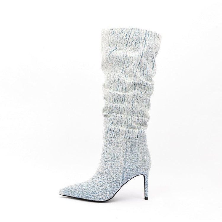 White Denim High Heel Tall Boots