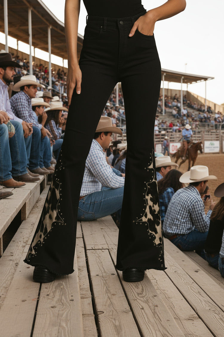 Turn heads in these black cowhide studded bell bottom jeans, a bold blend of western chic and modern glam. Crafted from premium stretch black denim, these statement jeans feature cow-print suede panels along the flared legs, finished with silver studs for a touch of attitude. Designed for comfort and confidence, they contour your shape while creating a dramatic flare that pairs perfectly with boots or heels.